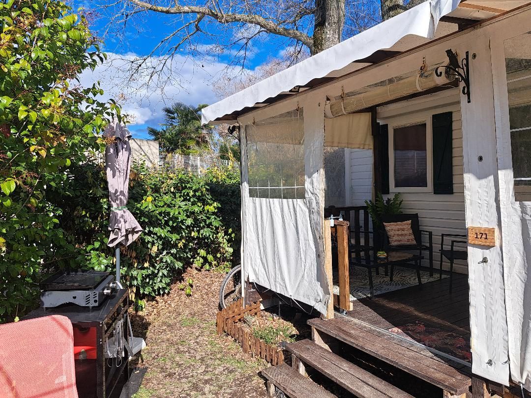 Une terrasse en bois couverte et fermée de 15 m² et éclairée pour vos soirées. Elle est équipée d'un portillon pour la sécurité des enfants, une table, 6 chaises, un étendoir à linge et un salon bas de jardin. Une boîte à clefs sécurisée vous permettra d'accéder au mobile home en cas d'arrivée tardive.